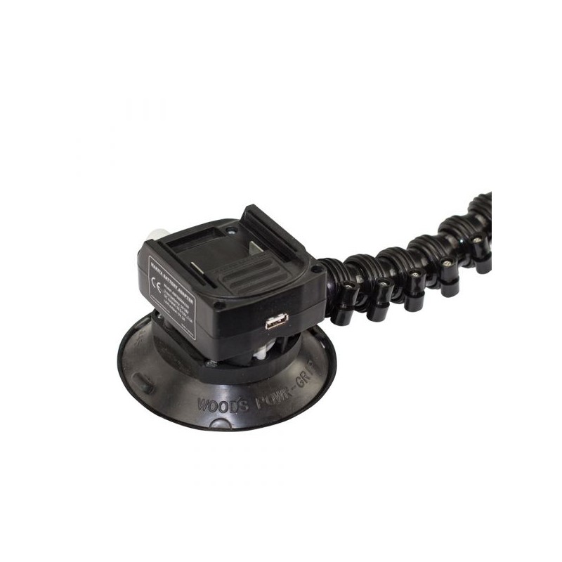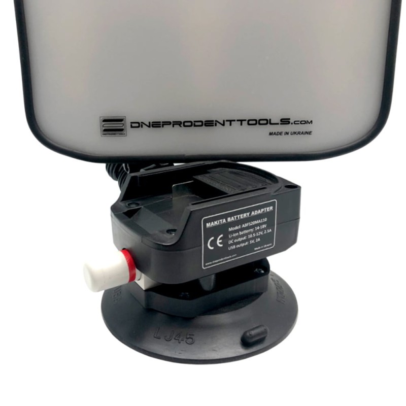 La lampe est alimentée par une batterie lithium-ion 14,4-18V (Makita) *, qui est connectée à un adaptateur de puissance spécial avec un verrou pour fixer la batterie et des contacts électriques. De plus, sur le boîtier de l'adaptateur, il y a une sortie USB pour recharger des appareils électriques et des gadgets.