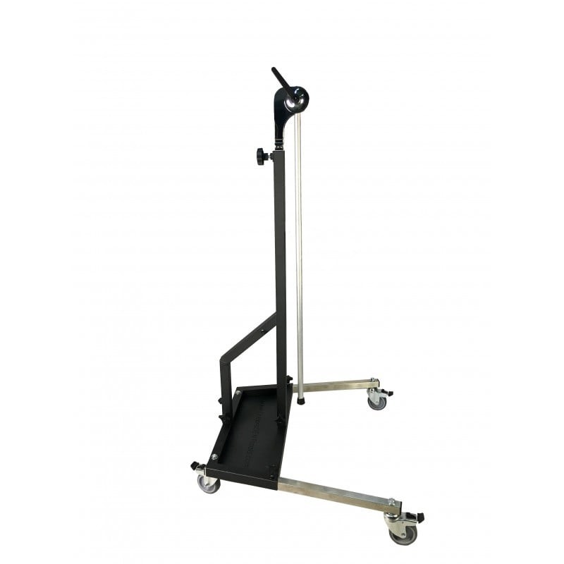 Le support "SOFFIT", modèle ST-2, est conçu pour le montage d'équipements d'éclairage professionnels utilisés pour la réparation de carrosserie automobile, en utilisant la technologie de "réparation de bosses sans peinture". Le support est fabriqué en tube d'acier profilé haute résistance de 30x30 mm, peint avec une peinture en poudre, et en tube profilé en acier inoxydable de 25x25 mm. Le bras incliné est fabriqué en tube d'aluminium rond de diamètre 19 mm, qui est fixé au support avec un mécanisme de rotation et de serrage. La conception du support est attachée à une base trapézoïdale, qui dispose d'un plateau pour installer la batterie, de jambes réglables rétractables et de quatre roues de support fixes.